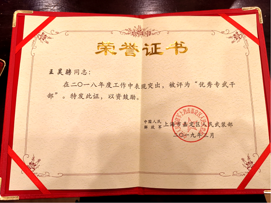王昊骋同志获“优秀专武干部”荣誉称号