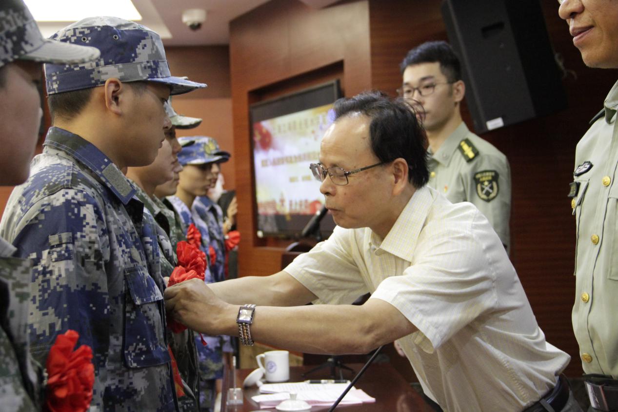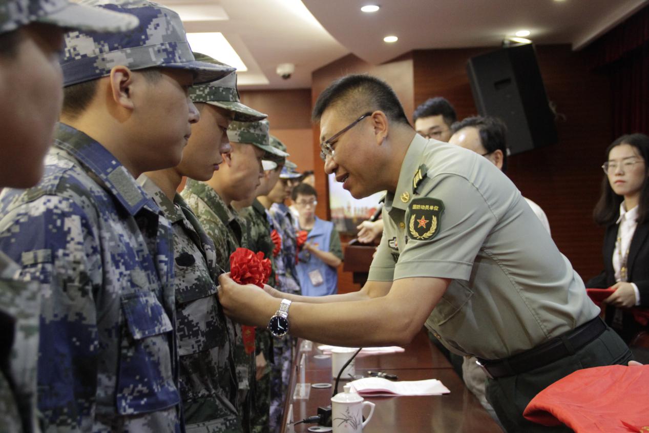 接着由嘉定区武装部领导和学院领导为入伍新兵代表佩戴大红花。
