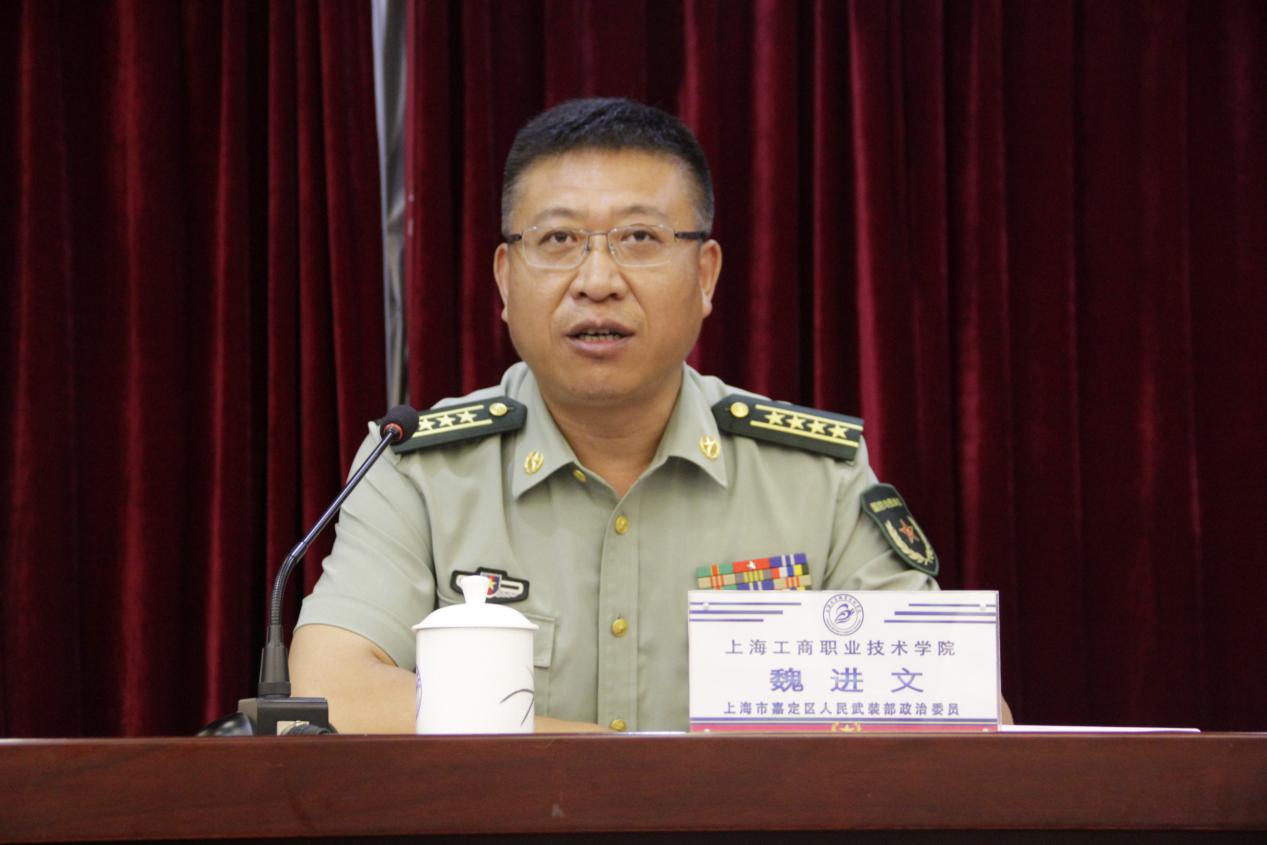 最后由嘉定区人民武装部政治委员魏进文讲话。他充分肯定了今年我院武装部在党委的领导下,不怕困难、迎难而上出色得完成了市人民政府、上海警备区所布置的各项任务并对我院武装工作给予充分的肯定和高度赞扬。对入伍新兵提出要求及新的展望,希望他们在今后的部队生活中,提高自己的综合素质,尽快完成从学生到军人的转变,早日成为一名合格的中国人民解放军,并把工商精神融入到军旅生涯中的点滴中去。在讲话的最后,他还特别提到了今天是九·一八事变纪念日,希望在座各位新生能够勿忘国耻,牢记使命,为祖国的强大贡献自己的一份力。