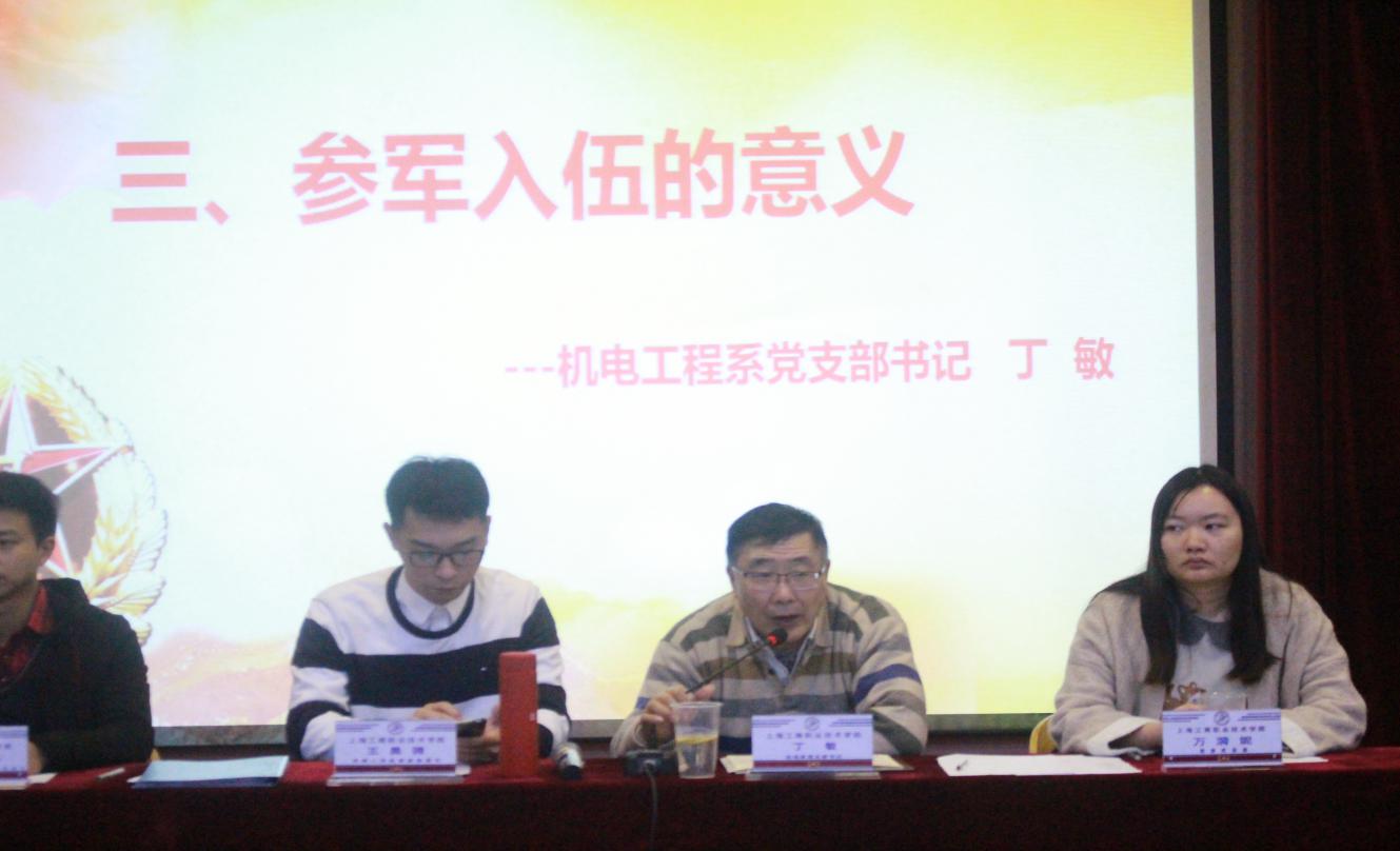 为贯彻落实全国征兵工作业务座谈会议,上海市大学生征兵工作会议,嘉定区征兵工作会议精神,做好2020年度春季征兵工作,激发我院广大适龄青年学生的参军热情,在学院党委具体安排部署下,学院征兵工作领导小组的指导下于2020年1月7日召开春季预征兵报名学生大会,参加会议的有:学院党委武装部副部长王昊骋,机电工程系党支部书记丁敏,党委武装部万漪妮,各系征兵工作分站站长,相关辅导员老师及各系报名参军学生。