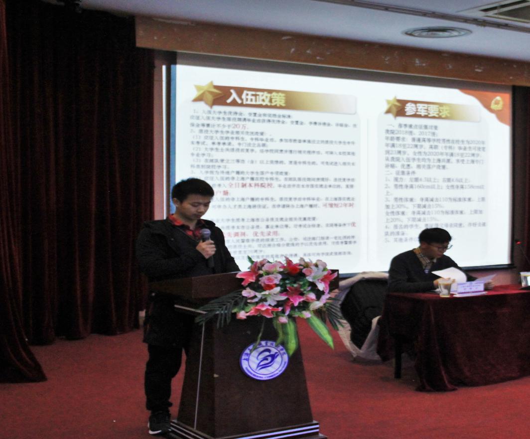 首先由商务与管理系征兵工作分站站长宋招科为我们介绍入伍政策和参军要求并就春季重点征集对象和征集条件进行讲解。