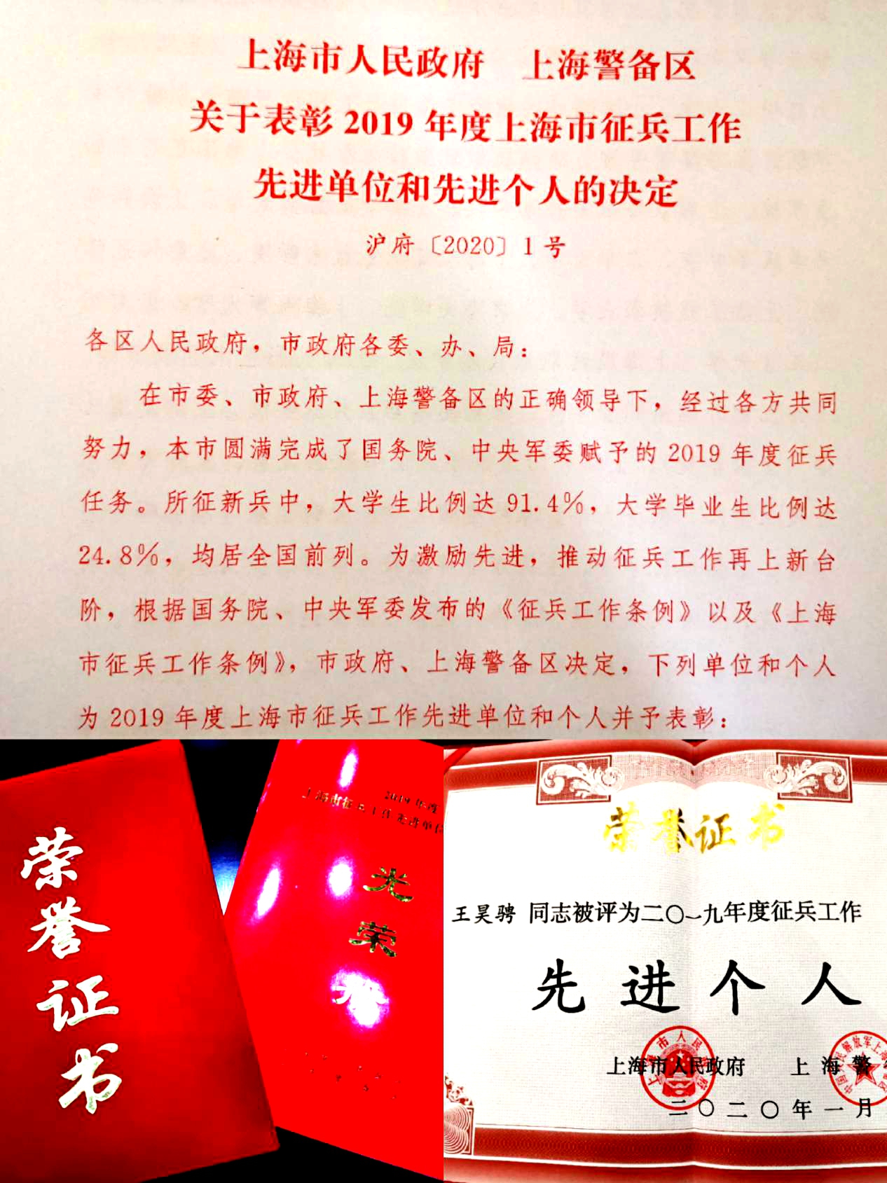 接着市政府副市长彭沉雷宣读了上海市2019年度征兵工作先进单位和先进个人表彰决定。学院荣获上海市征兵工作先进单位光荣称号,王昊骋同志荣获上海市征兵工作先进个人光荣称号。