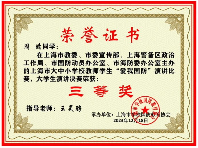 为深入学习贯彻党的二十大精神,贯彻落实《中华人民共和国国防教育法》《中共中央 国务院 中央军委关于加强和改进新时代全民国防教育工作的意见》《新时代爱国主义教育实施纲要》《上海市人民政府办公厅 上海警备区办公室关于深化学生军事训练改革的实意见》有关要求,近日由上海市教委、市委宣传部、上海警备区政治工作局、市国防动员办公室、市海防委办公室主办的上海市大中小学校教师学生“爱我国防”演讲比赛准决赛圆满结束,在经过专业评审的点评打分和线上网络人气投票的激烈角逐后,我校大唐信息技术学院张敏老师和教育学院周晴同学分别摘得“爱我国防”教师演讲决赛二等奖和大学生演讲决赛三等奖的荣誉。
